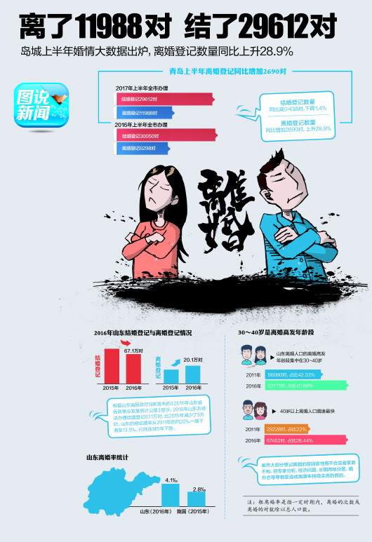 而根據山東省民政廳發布的《2016年山東省民政事業發展統計公報》顯示,2016年山東共依法辦理結婚登記67.1萬對,比2015年減少了3萬對。山東的粗結婚率從2011年的約20‰一路下滑至13.5‰,已經連續5年下跌。結婚的越來越少,離婚的卻越來越多,2016年民政部門登記離婚20.1萬對,比2015年多了1.6萬對,粗離婚率為4.1‰,比10年前的約1.5‰,高出了近3倍。雖然大部分登記離婚的原因是性格不合或者家庭不和,但專家分析,經濟問題、長期兩地分居、婚外戀等等都是造成離婚率持續走高的原因。