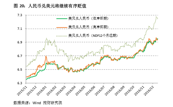 該報告預(yù)測:由于人民幣的定價機制已經(jīng)發(fā)生改變,2017年人民幣的走勢更多的要看外圍貨幣對美元的表現(xiàn)。鑒于經(jīng)濟增長前景方向不同,以及美國加息頻率可能加快,人民幣兌美元在2017年仍會延續(xù)下跌,但兌其他貨幣則將相對保持穩(wěn)定。