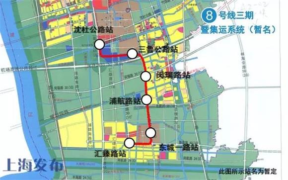 8號線三期自二期終點站沈杜公路站至匯臻路站,全長6.6公里,車站6座。目前車站已全部封頂。(8號線三期與以往軌道交通相比,有兩項主要創新,一是系統制式新:采用高度集成的APM膠輪路軌系統;二是功能定位新:是中運量城市末端客流收集系統,為大運量軌道交通系統的補充。主要功能是穿梭運營于閔行區浦江鎮區域,與8號線換乘接駁運營。因此8號線三期的線路命名將與上海既有軌道交通線路名稱有所不同,具體線名目前正在研究過程中。)