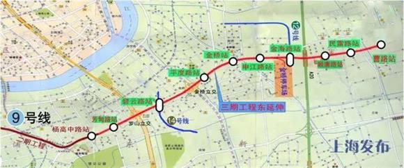 9號線三期東延伸(起自9號線二期工程終點楊高中路站,自西向東延伸,終點站曹路站),全長13.8公里、車站9座。目前全線結構貫通,正在進行軌道鋪設和車站裝修安裝施工。