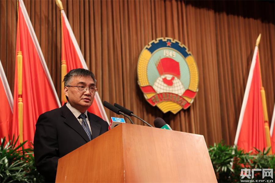 唐石青代表九三學社上海市委員會發(fā)言,發(fā)言的題目是《構筑知識產(chǎn)權人才隊伍 助力上海科創(chuàng)中心建設》(央廣記者傅聞捷 攝) -