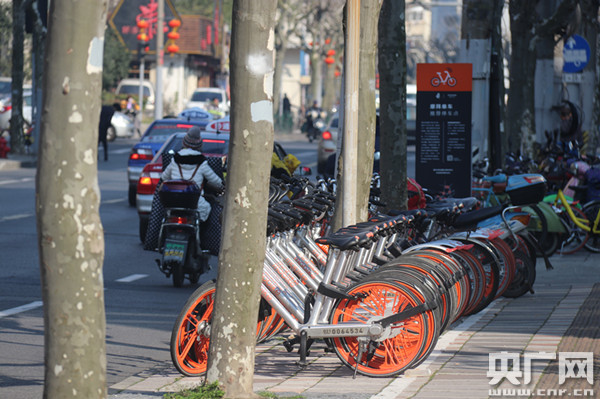 摩拜單車在推薦停車點整齊擺放(央廣記者傅聞捷 攝)
