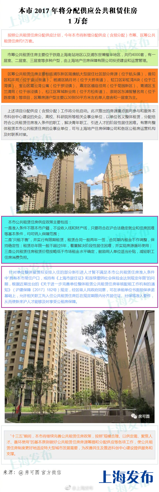 央廣網上海3月21日消息 據上海市政府新聞辦公室官方微博發布表示,按照公共租賃住房分配供應計劃,今年上海市將新增分配供應(含預分配)市籌、區籌公租房約1萬套。