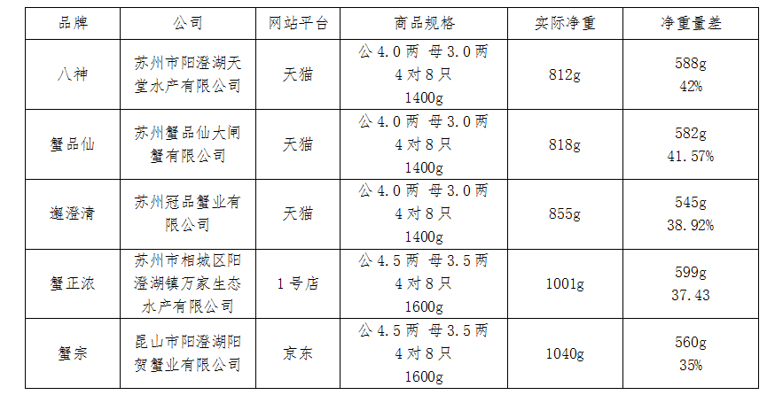 經過對計劃時間內到貨的23件大閘蟹產品的稱重,發現全部產品均存在短斤缺兩的問題,凈重量差在10.28%至42%不等。本次體察中分量相差最大的5件商品詳見下表。