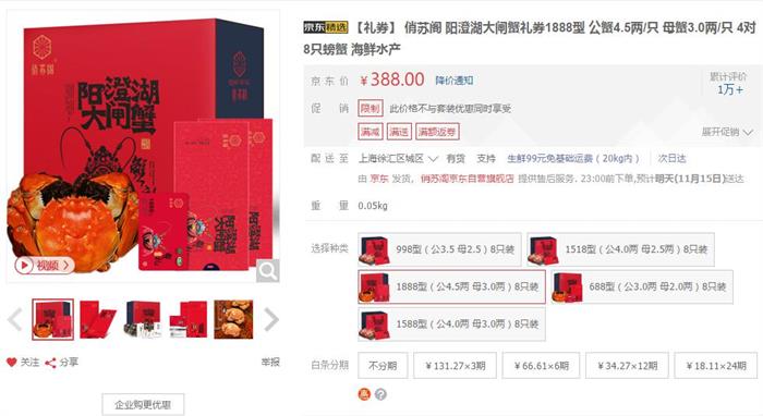 目前在售的蟹券品類繁多,價格差距較大。蟹券通常會標稱1888型、2388型、2588型,電商平臺的商品參考價、劃線價格,以及券面標稱價格很高,然而實際銷售差價較大。如天貓、京東等平臺的蟹券產品,劃線價格標稱面值高達數千元,實際售價卻只有幾百元。