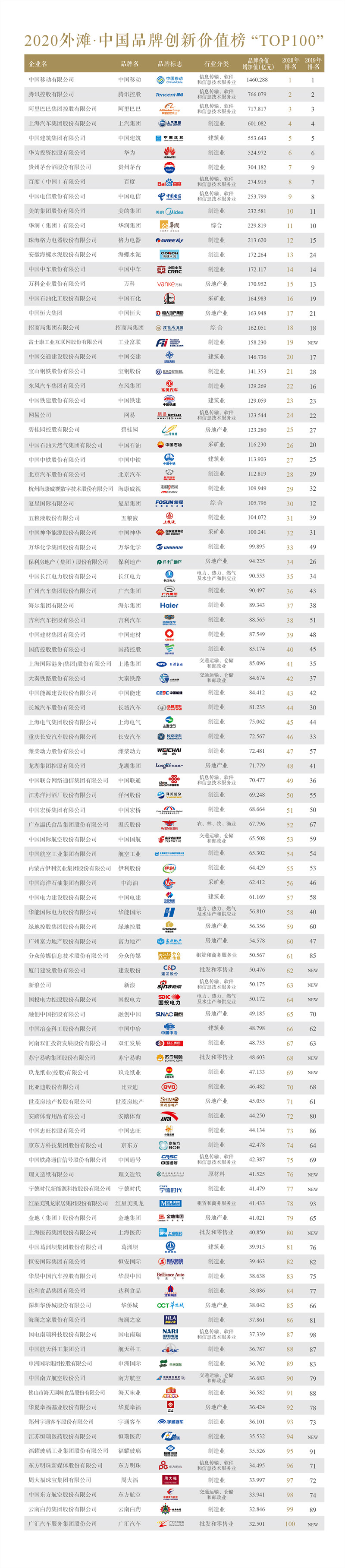 今年的榜單中,醫(yī)藥、食品與酒類品牌展現(xiàn)出良好發(fā)展勢頭,也是中國經(jīng)濟增長下行趨勢中的亮點,其中貴州茅臺連續(xù)兩年排位提升,今年提升2位,位居第7。主辦方表示,中國仍然是一個發(fā)展中國家,人口眾多,地域之間發(fā)展差異度大,因此決定了中國市場多樣性的特征:既有大眾品牌的市場容量,又有差異化品牌的成長空間。再加上互聯(lián)網(wǎng)和社交媒體的發(fā)展,品牌傳播速度大大提升,這為中國品牌滿足人們美好生活的需求,提供了更為有效的途徑。除了名酒品牌、知名藥企等傳統(tǒng)強勢品牌外,這次有多家企業(yè)第一次進入總榜單TOP100,尤其是具有核心研發(fā)能力和特定原產(chǎn)地效應(yīng)的品牌,成為發(fā)展態(tài)勢最平穩(wěn)的企業(yè)。
