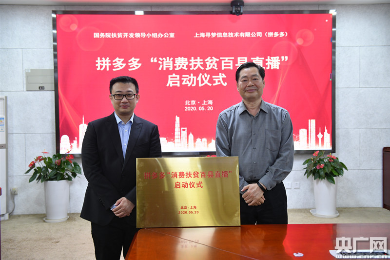 國務院扶貧開發領導小組辦公室副主任洪天云和拼多多聯合創始人范潔真共同啟動“消費扶貧百縣直播行動”(央廣網發 劉宇攝)