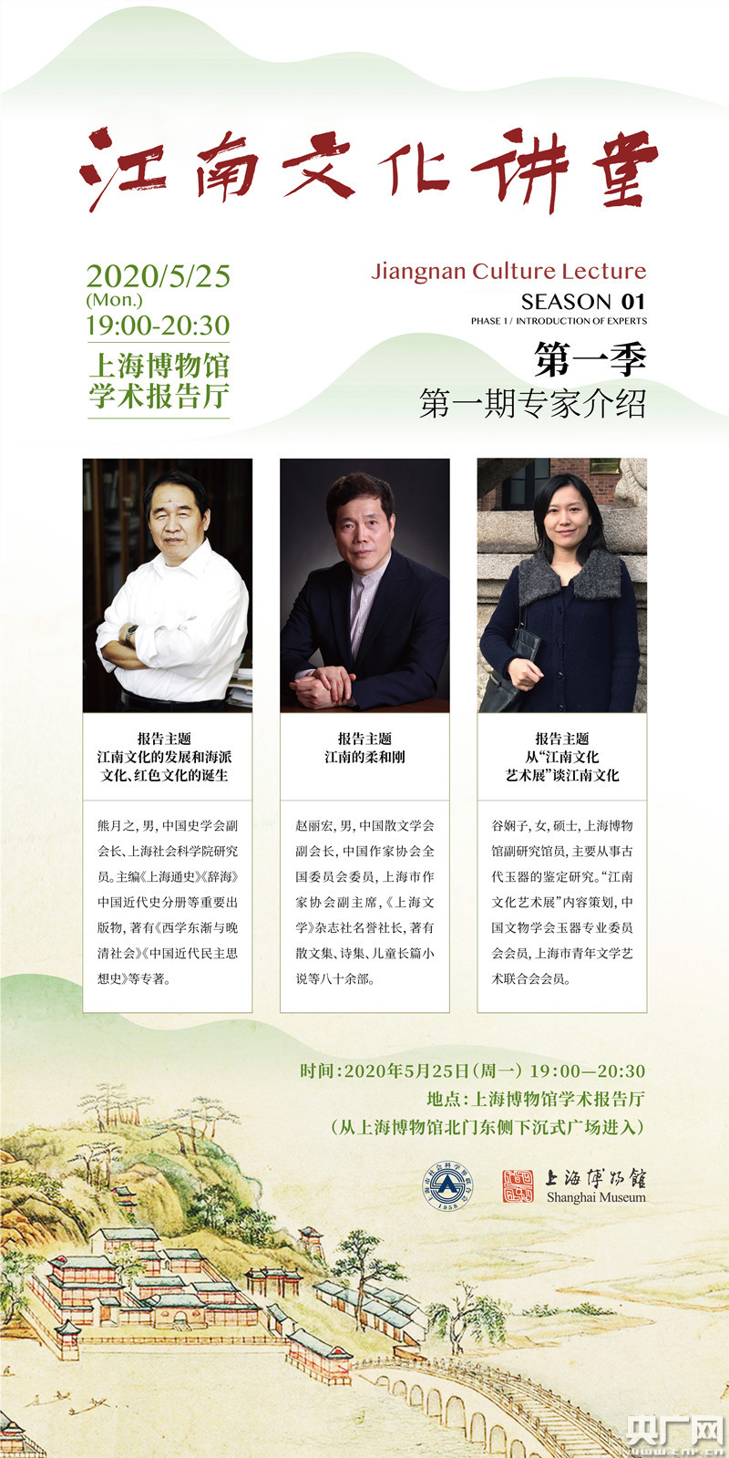 據(jù)了解,“江南文化講堂”作為公益性文化品牌項(xiàng)目,將聚焦江南文化主題,聚合海內(nèi)外特別是長三角區(qū)域江南文化研究力量和知名社科、文博專家學(xué)者,以“史”為線索,講授江南政治、經(jīng)濟(jì)、社會、科技、文學(xué)藝術(shù)等方面內(nèi)容,集中展示江南文化的獨(dú)特魅力。每季(1季周期為1年)至少舉辦10期活動,待疫情稍緩,講堂系列活動將逐步向廣大市民開放。
