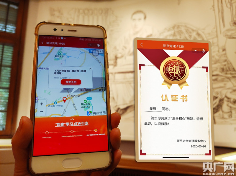 打開“復旦黨建·1925”微信小程序,全國黨建工作標桿院系物理學系黨委書記吳驊在“定向活動”模塊看到了一條個性定制的紅色行走路線。路線顯示以《共產黨宣言》展示館為起點,途徑中共一大會址紀念館,最終在中共二大會址紀念館完成行走。在相應場館完成線下學習后,黨員們點擊“我要簽到”,即在線上成功打卡。完成路線上的所有打卡后,一張專屬的認證書自動生成。