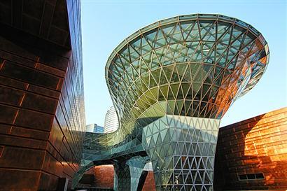 據世博會博物館工作人員介紹,上海世博會博物館由上海市政府和國際展覽局合作共建,建筑方案由華東建筑設計院設計。其中代表歷史、冥想和永恒的“歷史河谷”為主題展區和辦公區域,由165塊折面拼接而成。米色砂巖和銅鋁復合板組成的墻面仿佛歷史的“城墻”,給人一種莊嚴凝重之感。沿歷史河谷的臺階走上去,可以進入一個二層平臺,平臺上矗立著幾個表面有凹凸的鏡面裝置,它們還有著另外一層秘密。原來,這幾個鏡面裝置同時也是采光井,從底樓往上看,就會看到這幾個不規則的天窗。