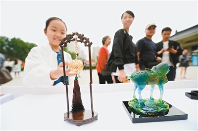 28日,在陜西歷史博物館前,剛剛上線不久的陜歷博旗艦店聯手京東舉辦了文創產品展示交流活動。1968年出土于陜西彬縣的五代·青釉提梁倒注壺是陜西歷史博物館館藏國寶級文物之一。陜西歷史博物館1比1復制的這件國寶級珍品,在展示現場備受游客矚目。此外,現場展示的瓦當書簽、鎏金銅蠶胸針、唐妞公仔、唐仕女冰箱貼等物品都吸引了游客的目光。