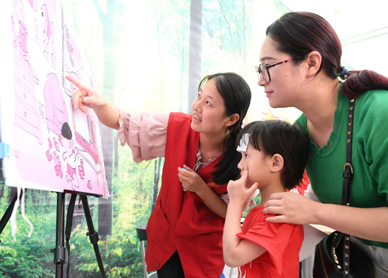 復(fù)旦大學(xué)附屬兒科醫(yī)院門診大廳內(nèi),志愿者在為患兒做意外傷害預(yù)防宣導(dǎo)。孫國(guó)根/攝