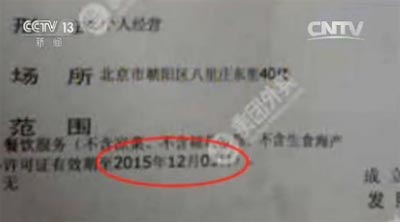 在美團外賣的應用平臺上,央視記者隨機搜索到一家“萬記麻辣燙”的商家,登記在平臺上的地址為:朝陽區八里莊東里小區41棟西側。而在美團外賣平臺上商家資質公示的證照上,登記的卻不是同一個地址。不僅如此,餐飲業必須具備的“三證齊全”卻只有“營業執照”和“餐飲服務許可證”兩證,而且這兩個證件上清晰地顯示,有效期截止日期均為2015年12月。