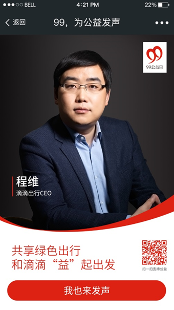 此外,“99公益日”期間,滴滴專車、快車、出租車、代駕、順風車等各個業務線將通過產品端發布渠道,集中推送倡導和支持環境公益的內容。同時,滴滴出行還將向用戶集中發送特別訂制的公益主題紅包,吸引和呼吁公眾更多關注環境公益。