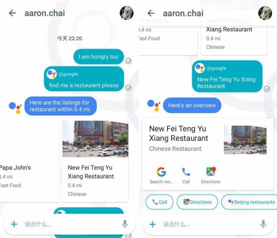 例如,當你打算與好友約飯時,不必退出聊天軟件搜索餐廳,只需要向Google Assistant發出指令,它便會為你呈現附近的餐廳列表,隨意點擊其中一家,即可了解該店鋪的聯系方式以及地址等。除此之外,Google Assistant在搜視頻、搜圖片,以及檢索資料、地址、天氣、航班等方面也都有不錯的用戶體驗。