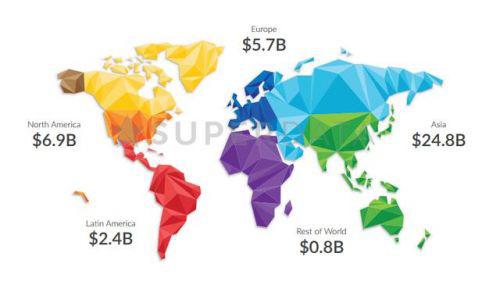 報告指出,2016年VR市場PC端總產(chǎn)值為7.18億美元,移動端6.87億美元,主機端為4.11億美元。在營收中,游戲表現(xiàn)搶眼,占據(jù)了44%的市場份額。除此之外,數(shù)據(jù)顯示,全球移動游戲收入為406億美元,手游市場規(guī)模已與全球電影票房收入持平,而且仍在高速增長。亞洲市場在整個手游市場中占據(jù)領(lǐng)導(dǎo)地位,份額達248億美元,北美以69億美元位居其次,歐洲以57美元位居第三。(TechWeb)