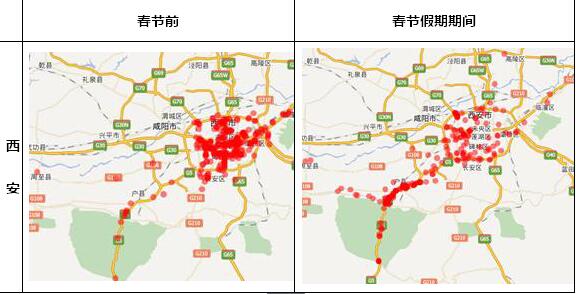 由上圖中偽基站活躍對比圖可知,春節期間偽基站短信分布重心,由城市的中心街道轉移到城市周邊的高速公路了,估計是騙子預測到春運期間高速公路上是人流最密集的區域。由此可見,春節期間偽基站不僅活躍城市發生了變化,在同一個城市的工作區域同樣發生了變化。