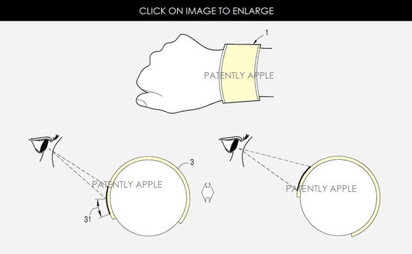 從專利圖中可以看出,這種智能手表的表盤外有一圈環形彎曲屏幕,可以顯示時間、天氣以及當前播放的音樂等。據稱環形彎曲屏幕將被未來的Gear智能手表采用。