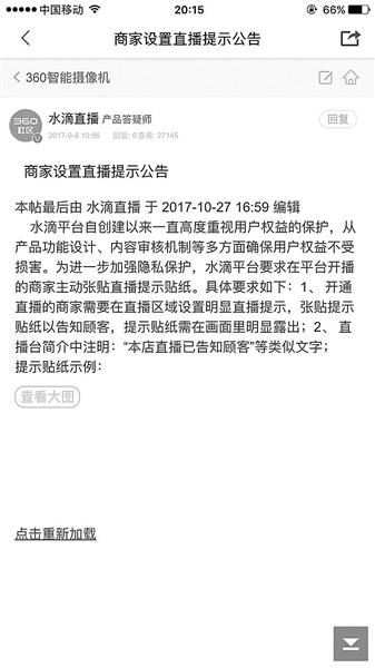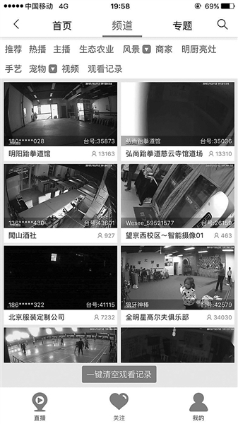 北青報(bào)記者在陳菲菲拍攝的視頻中看到,直播平臺(tái)平均每天觀看人數(shù)達(dá)到700多萬(wàn)。點(diǎn)開360攝像機(jī)的軟件,其中一個(gè)板塊叫做水滴直播,在上面能夠看到形形色色的監(jiān)控畫面。光是北京,正在直播的就有657個(gè)。文中提到,直播平臺(tái)要求用戶張貼直播告示,《商家設(shè)置直播提示公告》要求在平臺(tái)開播的商家需要在直播區(qū)域設(shè)置明顯直播提示以告知顧客,提示貼紙需要在畫面明顯露出,或者在直播臺(tái)簡(jiǎn)介中注明:“本店直播已告知顧客”類似文字,但調(diào)查者發(fā)現(xiàn)“商家不聽話,極少有張貼”。