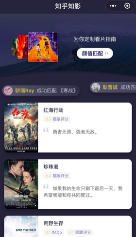 4月1日,知乎依托自身在電影領域的內容、數據優勢,面向影迷們推出了“知乎知影”小程序。