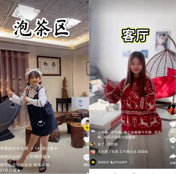 用戶“蘋果妹”( ID:pgm55400)是一個擁有303.7萬粉絲的快手大v,她給網友們分享了自己“如何在家一日游”:早上醒來,穿上精致可愛的衣服,客廳游、泡茶區游、種植區游、陽臺游、餐廳游、廚房、WC游,最后筋疲力盡回到床上。她的分享收獲了9.9萬人次點贊,近2000個留言。