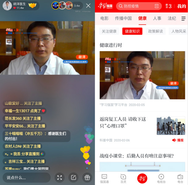 2月6日,“學(xué)習(xí)強(qiáng)國”學(xué)習(xí)平臺與快手?jǐn)y手,邀請相關(guān)領(lǐng)域?qū)<摇⒚t(yī),為全國用戶就疫情防護(hù)進(jìn)行不同主題的科普和答疑。首場直播由上海市肺科醫(yī)院副主任醫(yī)師胡洋主講,系統(tǒng)地介紹了疫情防護(hù)知識并為老鐵們辟謠。快手用戶為胡醫(yī)生送出181.35萬個贊。