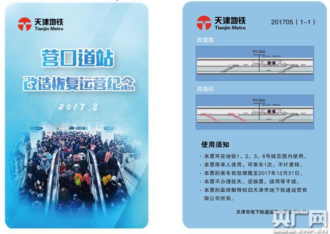 為感謝廣大乘客對營口道站改造的大力支持,天津地鐵運營公司將于8月16日同步限量發行2000套“營口道站改造恢復運營”主題紀念票。紀念票含地鐵乘次票一枚,持該票可在地鐵1、2、3、6號線范圍內乘車1次,不計里程,有效期截至2017年12月31日。該紀念票售價為20元/套,可在營口道、天津站、西南角、長虹公園、紅旗南路、西站、北站的客服中心購買,每人限購5套。