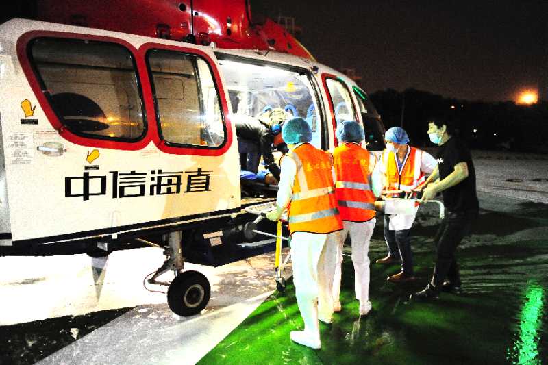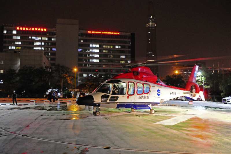 北大醫(yī)療海洋石油醫(yī)院立即啟動應(yīng)急預(yù)案,將患者心電圖、搶救用藥信息通過泰心互聯(lián)網(wǎng)醫(yī)院系統(tǒng)傳到泰心醫(yī)院胸痛中心,并決定啟動直升機(jī)救援,由海上平臺醫(yī)生護(hù)送患者前往泰心醫(yī)院胸痛中心。中信海洋直升機(jī)股份有限公司相關(guān)部門迅速進(jìn)行準(zhǔn)備,申請空域、準(zhǔn)備飛機(jī)、研究航線及天氣。同時,泰心醫(yī)院迅速啟動綠色通道,后勤人員迅速準(zhǔn)備停機(jī)坪,急診醫(yī)護(hù)隨時準(zhǔn)備接診,心內(nèi)科、超聲科、介入中心工作人員也嚴(yán)陣以待;飛機(jī)于23點21分升空,前往平臺救援!9日00點13分抵達(dá)海上平臺。00點20分飛機(jī)在平臺起飛,載著患者飛越112海里(200多公里),于1點10分抵達(dá)泰心醫(yī)院停機(jī)坪。
