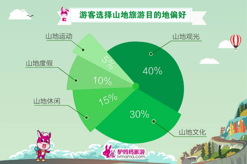 《報告》根據(jù)驢媽媽游客消費行為數(shù)據(jù)分析,目前超過40%的游客會選擇山地觀光為主的目的地。傾向體驗山地文化的游客占到了30%的比例,特別是少數(shù)民族聚居區(qū)和宗教文化濃厚的山地區(qū)域。而選擇山地休閑游的比例占到了 15%,此類旅游資源大多分布在城市近郊。另外也有10%的游客選擇山地度假。值得一提的是,選擇山地運動的游客增長趨勢明顯,占比超過5%,游客參與的山地運動項目包括徒步、滑雪、露營和馬拉松等。