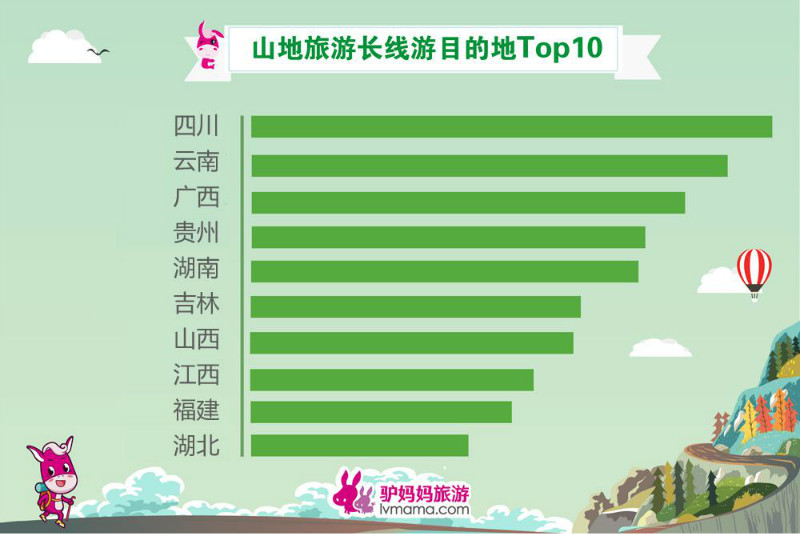 《報告》根據(jù)過去一年驢媽媽平臺上預(yù)訂山地旅游產(chǎn)品和景區(qū)門票的數(shù)據(jù),統(tǒng)計出了最受山地游客歡迎的周邊游目的地和長線游目的地。黃山、成都、舟山、湖州、樂山、臨安、清遠、泰安、承德、金華成為國內(nèi)十大熱門山地周邊游目的地。而長線用戶則更加偏愛四川、云南、廣西、貴州、湖南、吉林、山西、江西、福建、湖北等擁有豐富山地旅游資源的省份。