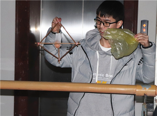 比賽分為設(shè)計(jì)比拼和技術(shù)比拼兩部分。每個小組首先要對模型進(jìn)行展示,讓觀眾、評委老師對選手的設(shè)計(jì)有初步的印象和了解,隨后進(jìn)入激動人心的技術(shù)比拼環(huán)節(jié),各小組帶著他們的裝置及雞蛋來到了實(shí)驗(yàn)室四樓準(zhǔn)備就緒。裝置設(shè)計(jì)牛不牛?一摔便知曉!