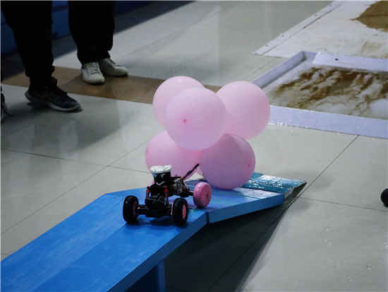 大大的紙箱保護(hù)著雞蛋,再栓上氣球,雞蛋如一個遠(yuǎn)行的孩童四處探尋生活的意義——起飛、落地、越野、完好無損!“飛蛋旅行”計(jì)劃成功!“TOP白給隊(duì)”的“飛蛋旅行記”給人以大大的驚嘆號。“大紙箱和氣球都是保護(hù)裝置,氣球具有彈性能起到減震作用,可以幫助穩(wěn)定下落的紙箱,以便雞蛋成功運(yùn)輸。”成員之一、18車輛專業(yè)岑金洲解釋他們的設(shè)計(jì)思路。這次,在運(yùn)輸裝置上他們利用了TOP模型協(xié)會閑置的遙控越野車架,通過對電子調(diào)速器和控制接收器更換的方式,帶領(lǐng)雞蛋順利通過沙地賽道、淺水池、獨(dú)木橋。賽后,他們感言,“在速度控制上我們還有更多的改進(jìn)空間,不過總的來說收獲很大!在合作中我看到了團(tuán)隊(duì)的力量!”