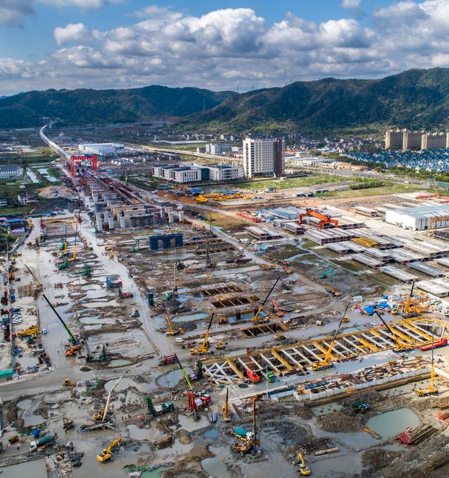 杭紹臺(tái)鐵路臺(tái)州中心站施工現(xiàn)場(chǎng),幾十臺(tái)大型機(jī)械同時(shí)作業(yè)形成一片大干之勢(shì) 郎成濤 攝