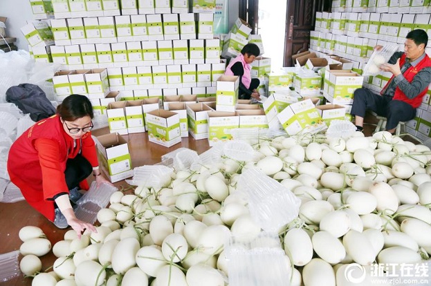 11月8日,嘉善縣羅星街道馬家橋村甜瓜交易中心,幾名黨員志愿者正在幫忙包裝甜瓜。自秋甜瓜上市以來,該村每天都會有黨員志愿者和巾幗志愿者在甜瓜交易中心幫忙。馬家橋村是“甜瓜之鄉(xiāng)”,今年又新種植了網(wǎng)紋瓜品種。(浙江在線拍友 胡凌翔 孫雋 攝)