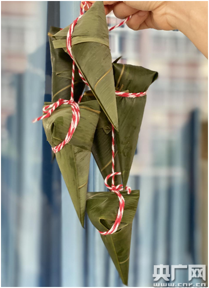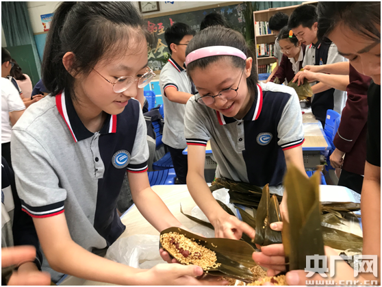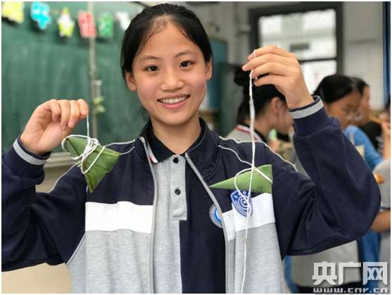 折葉、盛料、壓實、裹葉、扎繩……一雙雙忙碌的手穿梭在一張張翠綠的粽葉間,一道道工序有條不紊地進行著,一片片清香的粽葉、一粒粒晶瑩的糯米,在同學們靈巧的手中翻轉飛舞,轉眼就變成了一個個誘人的粽子。