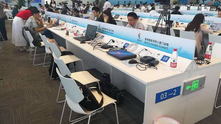 這種熟悉感,其實來自于新聞中心的桌椅。為了環(huán)保,廈門會展中心特地從G20杭州峰會新聞中心租借了當(dāng)時使用過的桌椅來布置金磚峰會的新聞中心,這真是個非常綠色節(jié)能的好想法。記者不禁在想,自己正坐著的椅子,用著的電腦桌,會不會正好是去年G20杭州峰會用過的那個呢?